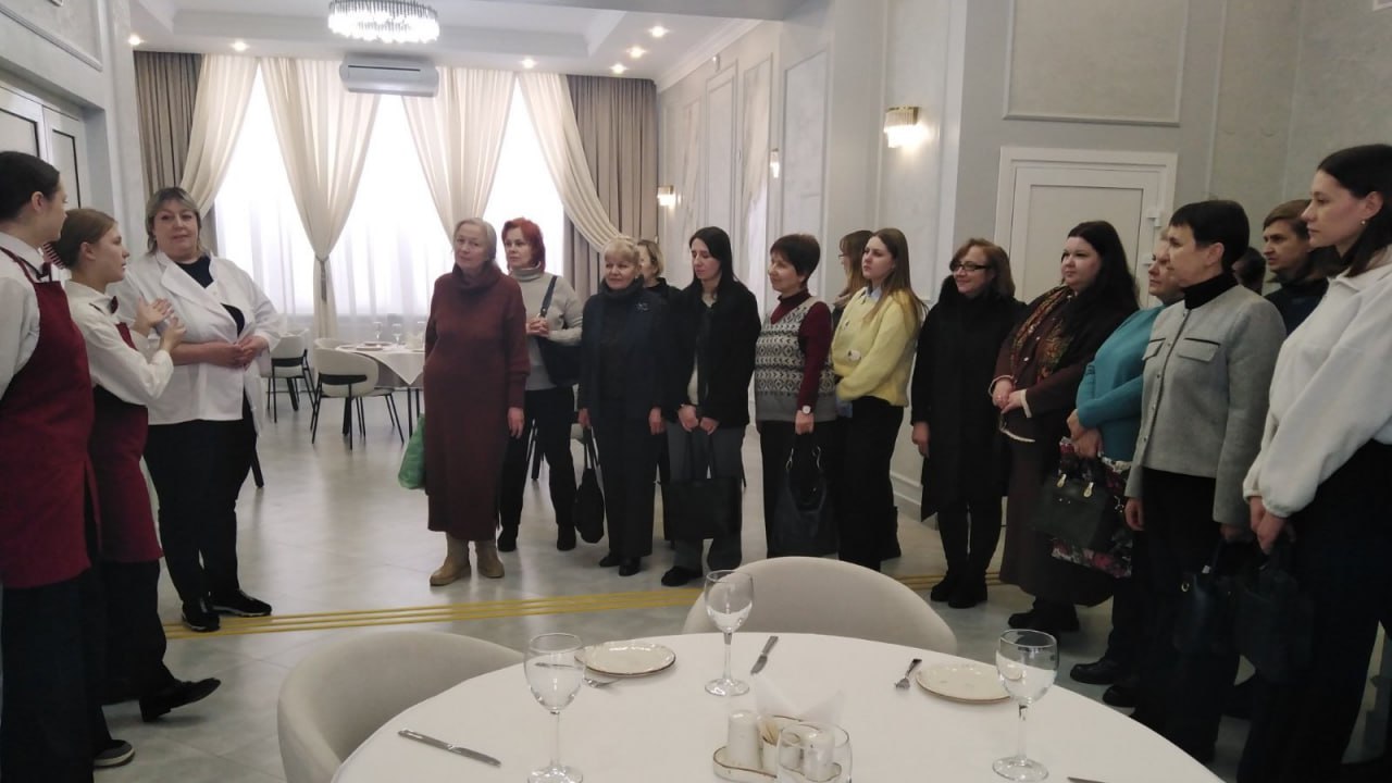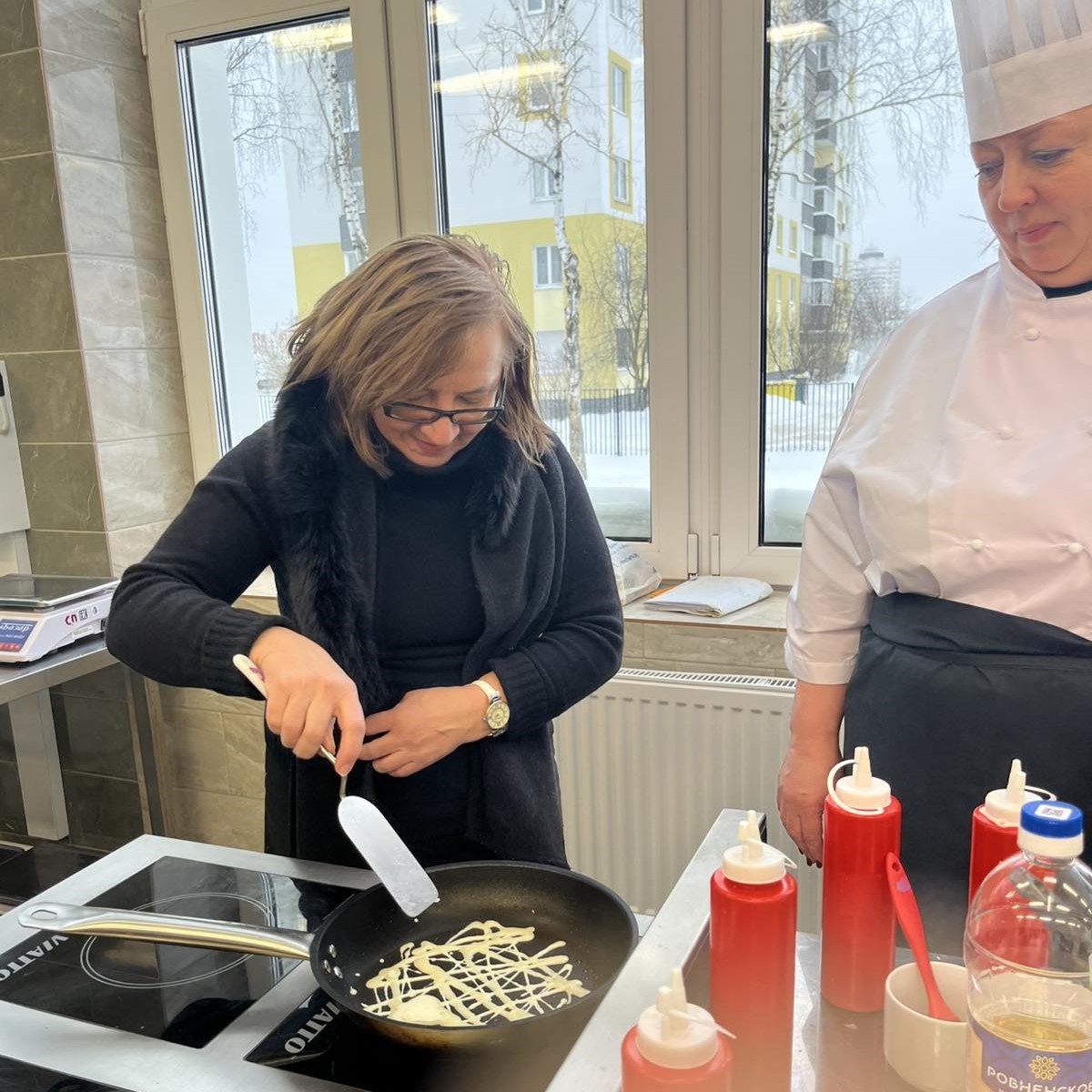Мастер производственного обучения высшей квалификационной категории Елена Геннадьевна Шидловская познакомила педагогов с современным высокотехнологичным оборудованием для приготовления пищи, продемонстрировала рациональные трудовые приемы, поделилась секретами профессионального мастерства по вовлечению учащихся в производственный процесс и формированию навыков хозяйственно-трудовой деятельности.